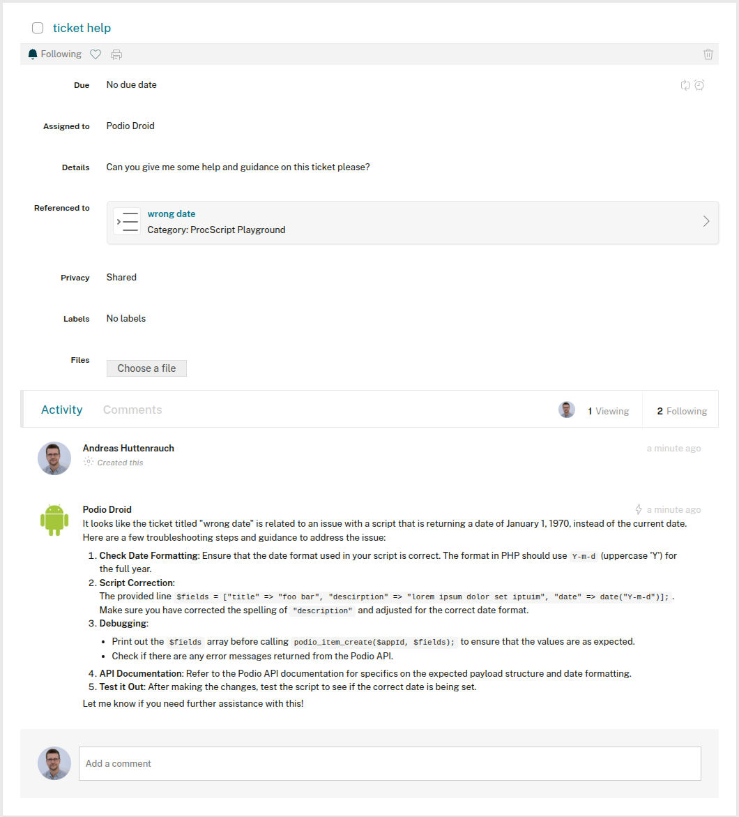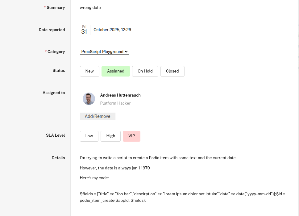As an example, I’m going to use a ticket in our ProcFu helpdesk app in Podio: