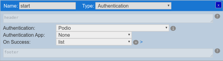 We’ll set the authentication to be Podio with no users app (assuming users of this app will have access rights in Podio directly).