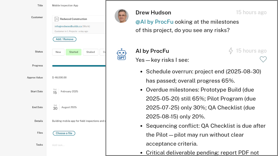 - Assign a task to “AI by ProcFu”. The AI will figure out a response and comment back on that task. You can comment back on the same task, and the AI will iterate further.