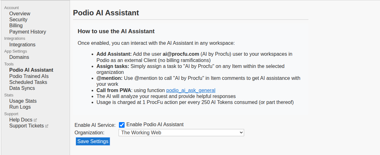 - In your ProcFu account, go to “Podio AI Assistant” in your account settings, and enable it for your organization.