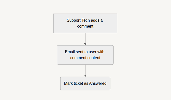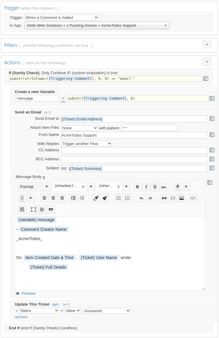 We also need a way for our support techs to send responses to users’ tickets. We will just leverage the comment field for this. If a tech adds a comment starting with “email:”, we’ll have a flow send that email to the user and mark the ticket as “Answered”.