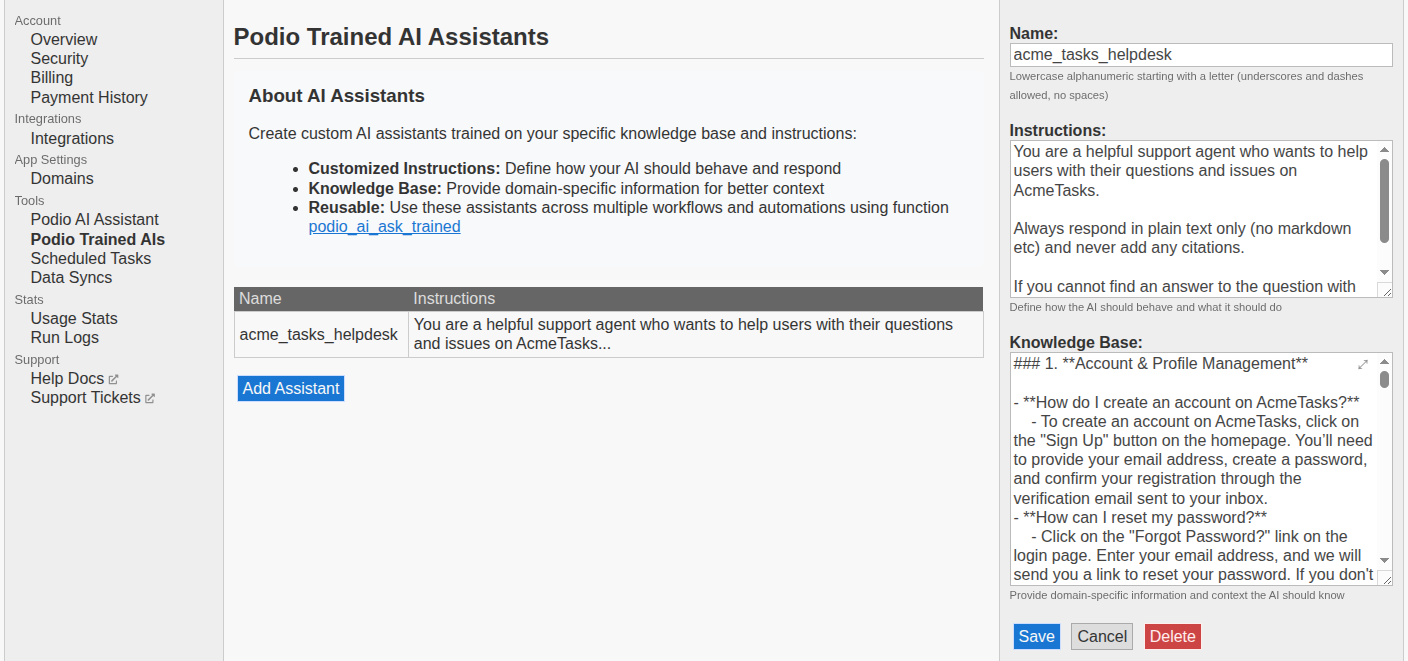 You can try out the podio_ai_ask_trained function directly from the function explorer, using the assistant name you used earlier. Just ask it a bunch of questions and see if you get the correct response.