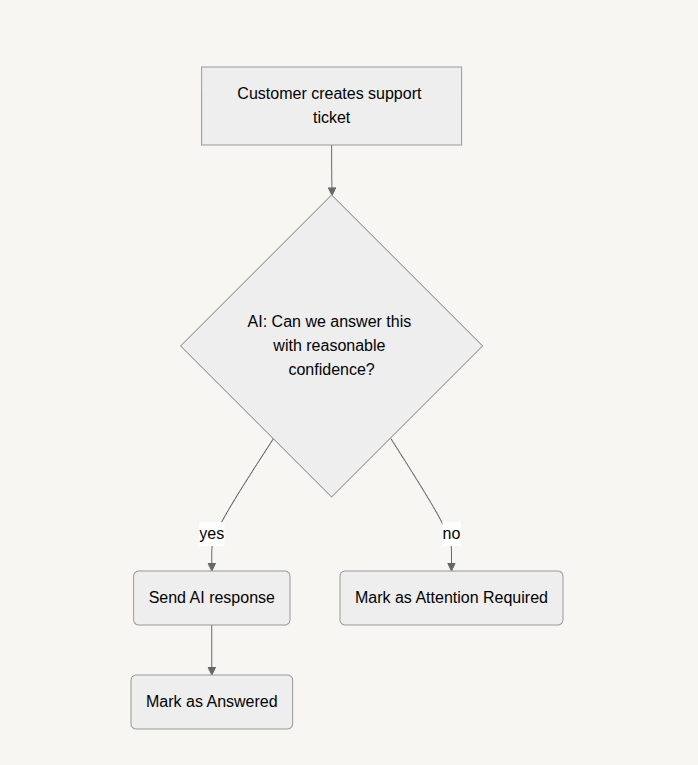 When a new ticket is created we’ll want to ask the AI assistant, and either send a response to the user, or mark the ticket as “Attention Required”.