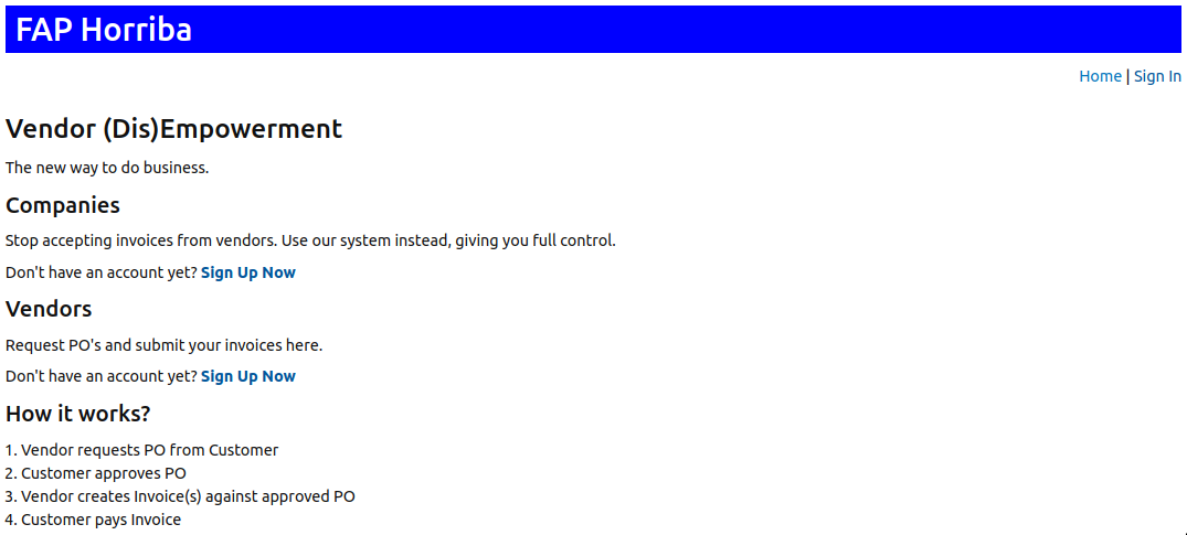 This demo is a customer vendor portal, allowing vendors to request purchase orders from customers, and to submit invoices on approved PO’s.